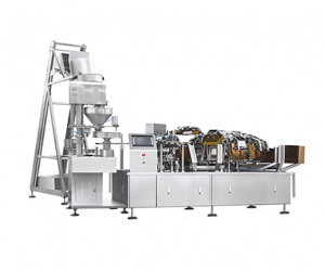 Automatic Rotary pouch packing system is suitable for premade pouches and application that require many different sizes which need quick size change.